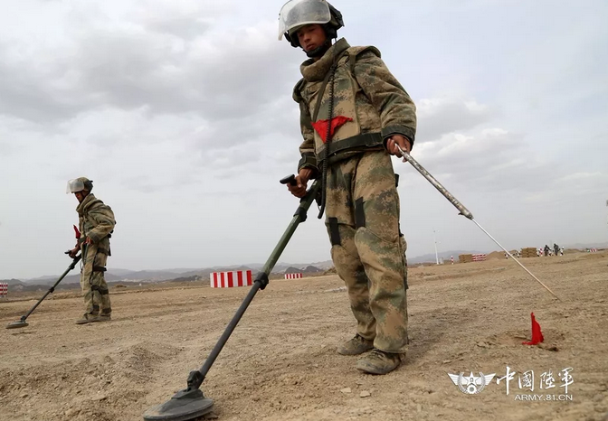 淺灘偵察,接到指令后,裝甲運輸車(chē)快速沖擊至淺灘障礙前,工兵班組魚(yú)貫而出,排雷手身著(zhù)20公斤的搜爆服在濁水進(jìn)行排雷作業(yè),水柱騰空而起,防坦克地雷被成功起爆。沖出險灘后,一片高密度、多型號的雷場(chǎng)封鎖了裝甲車(chē)前進(jìn)的道路,兩名投錨手將半發(fā)雷引爆后,探雷手立即手持探雷器,開(kāi)始了探雷作業(yè),為了使作業(yè)環(huán)境更加貼近實(shí)戰,他們還在雷場(chǎng)中專(zhuān)門(mén)增加設置了鐵絲彈殼等金屬干擾物。