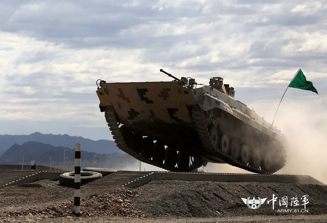 集訓官兵駕駛戰車(chē)快速通過(guò)車(chē)轍橋